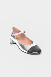 Scarpa accollata bebè Alexandra pelle laminata argento e punta nera n393