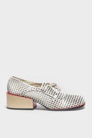 Scarpa traforata in pelle bianca con lacci e tacco quadrato.