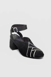 Scarpa accollata Alexandra in camoscio nero con inserti bianchi, chiusura con fibbia alla caviglia.