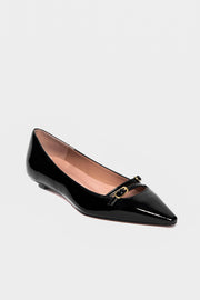 ballerina a punta in vernice nera con due fascette e fibbie sulla tomaia