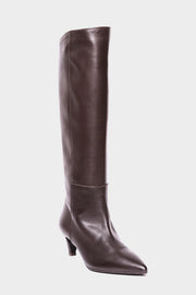 stivale in pelle marrone, forma a punta, gambale morbido senza cerniera