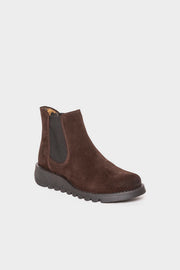 Chelsea Boot Fly London in pelle marrone con pratici elastici laterali. La fodera interna è in tessuto e con suola in gomma rialzata al tallone di 3 cm.