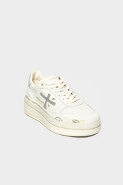 Sneakers panna in vera pelle con logo laterale . Tallone nero con logo. Chiusura con lacci animalier in tessuto. Logo riportato sulla linguetta. Suola over di 4.5 cm. Intersuola impreziosita dalle classiche stampe Premiata. Soletta in vera pelle estraibile.