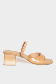 Sandalo a punta quadrata realizzato in vernice. Design minimalista, cinturino elasticizzato sul tallone e tacco largo con finitura sfumata.