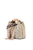 Secchiello jacquard con applicazione di frange e borchie, manico in legno fasciato con camoscio, tasca interna e tracolla jacquard.